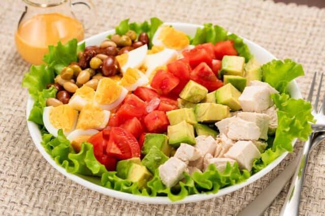 「サラダ=痩せる」は思い込み。ベーコン、チーズ、揚げ物、ナッツ類などが乗ったボリューム系サラダは、1皿500kcalを超えることもあります。さらに、シーザーやごまなどのこってりドレッシングをたっぷりかければ、ラーメン並みの高カロリーメニューに!