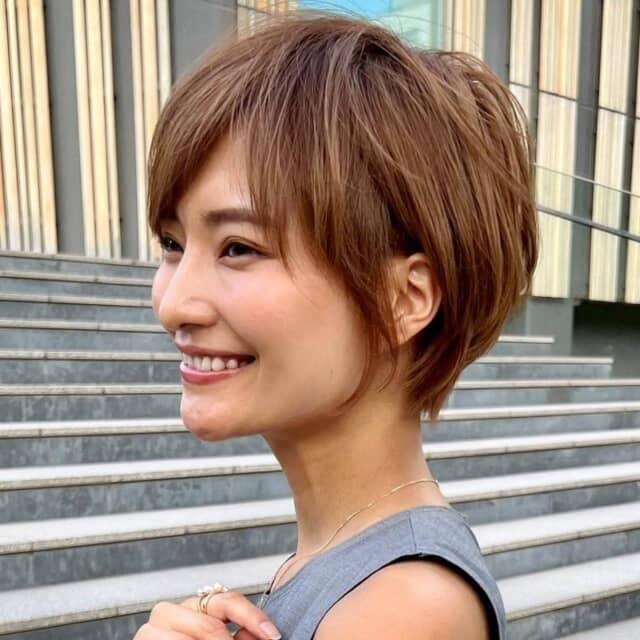 ショートボブを今っぽく見せるカギは、顔まわりのレイヤー。頬やフェイスラインをさりげなく覆う毛束が、輪郭をソフトにカバーし、小顔見えを叶えます。