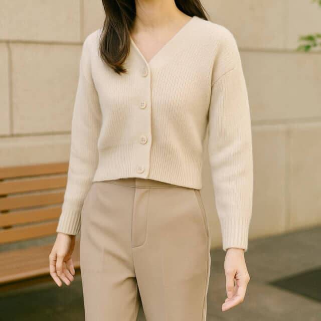 “ロングカーディガン”は重たく見える。今はショート丈で軽やかに