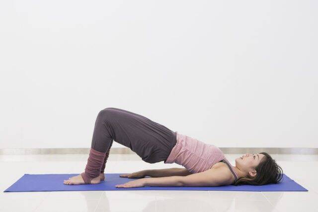 (2)一旦息を吸ってお腹を薄くし、お腹を薄くした状態のまま息を吐きながら、両ひざをくっつけた状態で腰から首の順に背骨を少しずつ床からはがしていくよう腰を持ち上げる