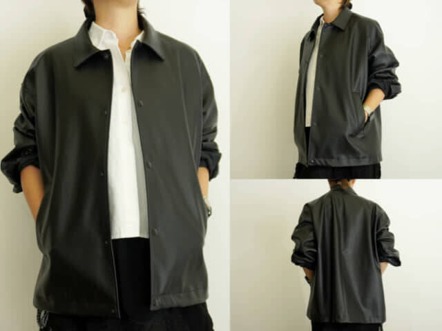 今年も人気が続くレザージャケットは、あえてメンズアイテムを選ぶことでシルエットに“ゆとり”が生まれ、こなれた雰囲気に仕上がります。PLSTの「フェイクレザー コーチジャケット」は、オーバーサイズでもきちんと感が残る絶妙なバランスが魅力。ショート丈シャツやタイトスカートと合わせれば、フェミニンさの中に程よいハンサムさがプラスされ、大人らしいメリハリが生まれます。