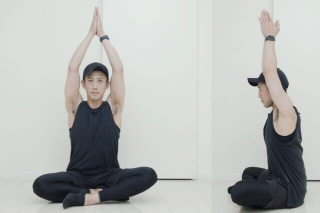 (1)床の上であぐらをかき、両腕をまっすぐ上げて手のひらを合わせる