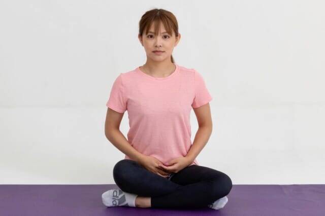 (2)立てている方のひざをかかえて背筋を伸ばし、坐骨をきちんと床につける意識でひざを胸に引き寄せ、ゆっくり呼吸しながら30秒間キープする