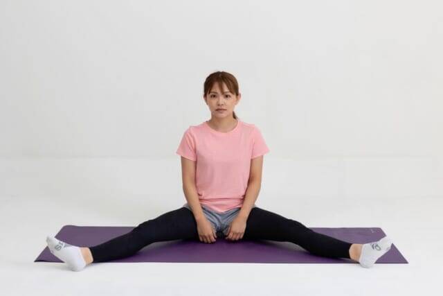 (1)開脚して座り、お尻の下に丸めたタオルを入れる