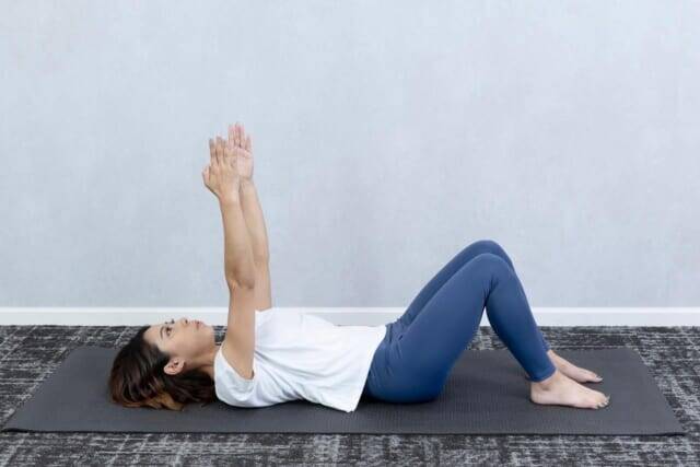 (1)仰向けになって両腕を天井方向にまっすぐ伸ばし、両脚をにぎりこぶし1個分開く