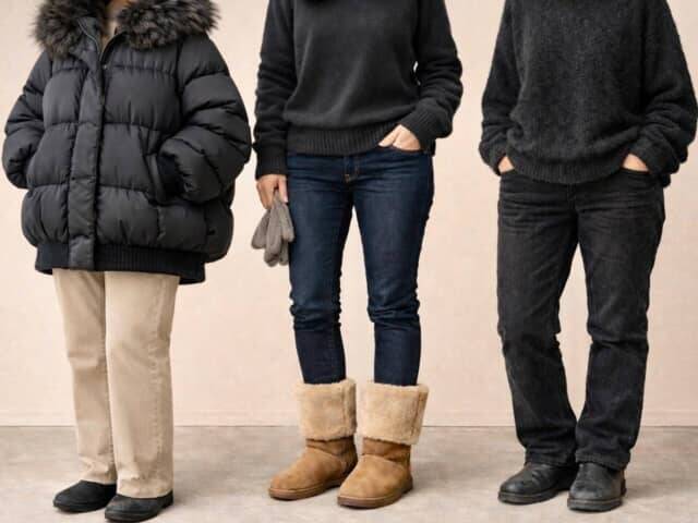 ▲ボリュームや素材の印象が重なり、温かいのに“昔のまま”に見えやすいアイテム&組み合わせ