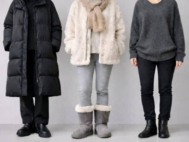 ▲同じ防寒軸でも、丈・色・素材の選び方で軽さと立体感が戻ります。短丈アウター、明るいボトム、柔らかい色のニットで温かいまま更新。