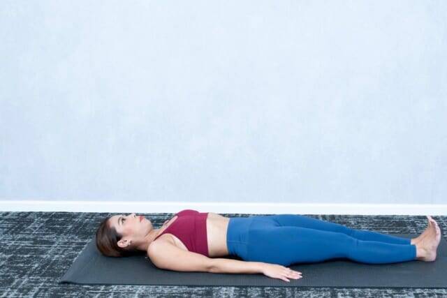 ▲両脚は脚の付け根から曲げて子宮まわりの筋肉を刺激します