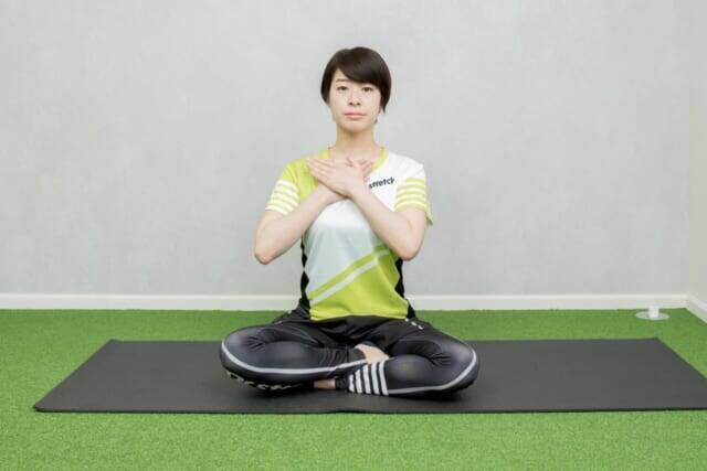 (1)あぐらをかく姿勢になり、右側の鎖骨の下(中心よりも少し右)に両手を添える