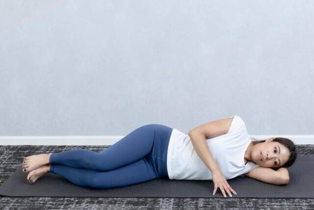 反対側も同様に実践します。なお、期待する効果をきちんと得るためには「かかとをくっつけたまま行うこと」、「骨盤を床に対して垂直にキープすること」がポイントです。骨盤まわりが安定すると、ヒップの位置や脚のラインまで自然と整って見えるように。鏡の前で感じる下半身の印象が、少しずつ変わってくるはずです。<ピラティス監修:Minami(トレーナー歴4年)>