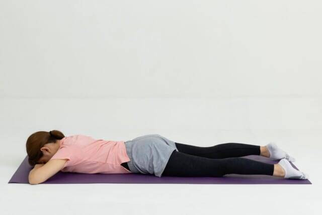 (1)床にうつ伏せになり、両脚を腰幅に広げる