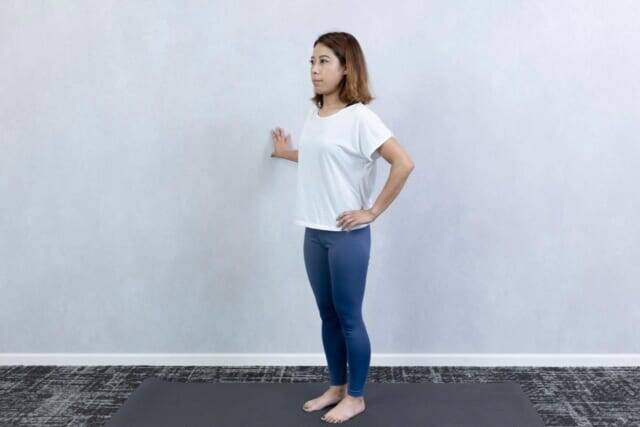 ▲右手を壁に添え、左手を腰に添えて耳、肩、腰、ひざ、くるぶしが一直線になるよう姿勢を正して立ちます