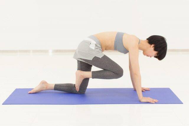 (1)ひざを開いて四つん這いになり、片脚を宙に浮かせて片方のひざを胸に寄せる