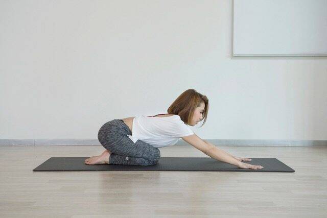 (2)両腕の間に顔を沈めておでこを床につけ、ゆっくり3~5呼吸(約30秒間)キープする