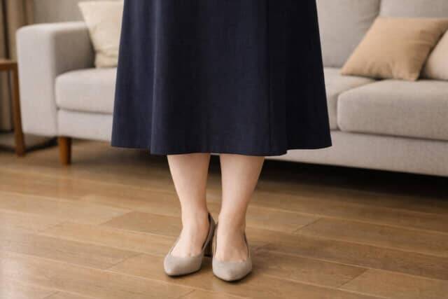 丈に迷ったときの目安はシンプル。足首がすっと見える丈か、床に近いフルレングスです。このどちらかに振り切るだけで、縦ラインが強調され、下半身がすっきり見えます。ミディ丈を選ぶ場合も、ブーツやヒールで重心を上げるなど、足元とのバランスを意識することで一気に垢抜けた印象に変わります。