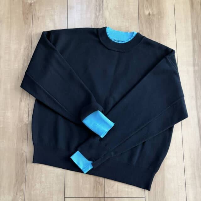 ベースは着慣れた黒。でも首元と袖口に効かせたブルーが、レイヤード風の奥行きを演出。色の面積が小さいから派手にならず、それでいて確実に印象を変えてくれる絶妙バランスです。