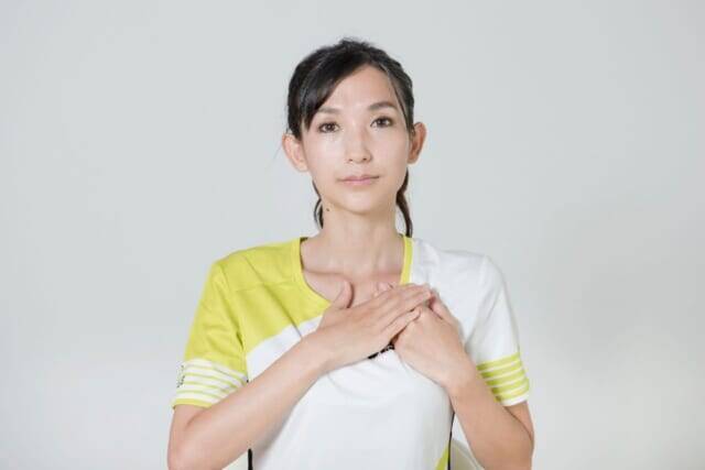 (1)左側の鎖骨の下に左手の指3本(人指し指、中指、薬指)を置き、右手でその上から軽く押さえる