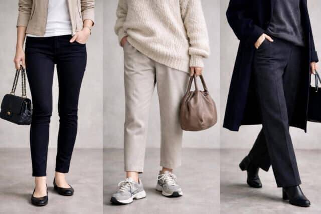 今季は、脚の形をなぞりすぎないストレートやセミワイドが中心。適度なゆとりがあることで縦の流れが生まれ、同じシンプルなコーデでも印象が軽く整います。細身を選ぶ場合でも、膝下に余裕のあるシルエットを選びましょう。