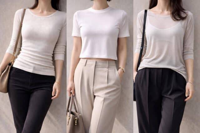適度な厚みと、落ち感のある素材を選ぶだけで、トップス1枚でもきちんとコーデは成立します。袖やネックにさりげない設計があるものを選べば、より洗練感も高まるでしょう。