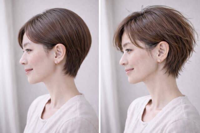 スタイリング剤も重すぎるものは避け、軽めのオイルやバームを薄くなじませる程度がベター。耳まわりに立体感が残ることで、横顔に抜けが生まれ、ショートでも柔らかさを感じる仕上がりになります。