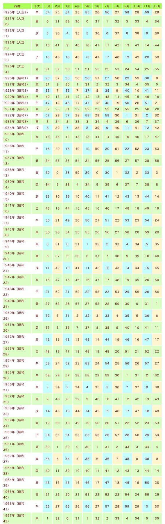 まず下の表から「生まれた年」と「生まれた月」の交わるところを確認し、その数字に「生まれた日」を足してください。 ※61を超えたら、60を引く