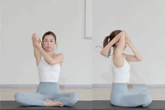 あぐらで座り、水を入れたペットボトルを片手に持って腕を真上へ。ひじを後ろに曲げ、反対の手でひじを軽く支えます。ひじは耳よりやや前の位置にセット。背すじを伸ばし、お腹を薄く引き込んで体幹を安定させます。