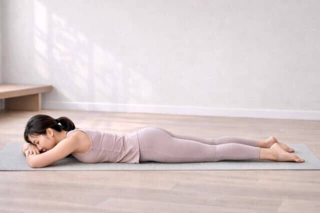 床にうつ伏せになり、脚は腰幅に開きます。両腕はおでこの下に重ねてリラックス。ここで意識したいのは“腰を反らせないこと”。お腹を軽く引き込み、骨盤が安定した状態をつくります。