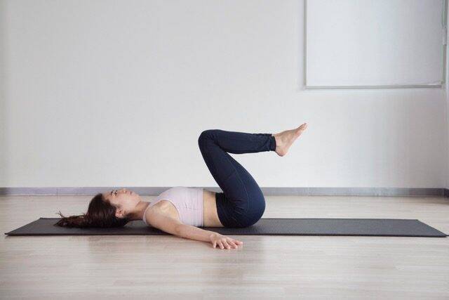 仰向けに寝て、両ひざを持ち上げて股関節とひざをそれぞれ90度に曲げた“テーブルトップ”の姿勢をつくります。すねは床と平行に。腕は体の横に置き、手のひらは上向きに。息を吐きながらお腹を軽く引き込み、腰が反らず、背中が床に安定している状態をキープします。