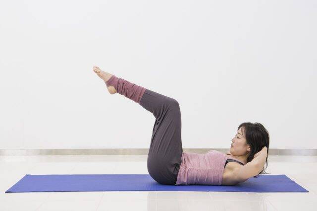 床に仰向けになり、両脚を持ち上げます。上半身は軽く起こし、両手は頭の後ろへ。脇をしっかり開いた状態をキープしながら、首だけで持ち上げないように注意。お腹全体で支える意識を持ちましょう。