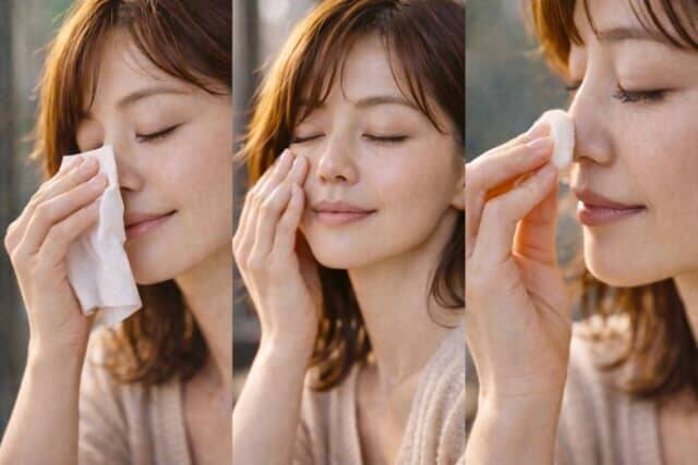 ▲余分な皮脂をティッシュで軽くオフし、指でやさしくなじませたあと、小鼻やTゾーンにだけパウダーをのせることで、崩れても自然に整った肌印象をキープできます