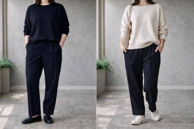 黒か淡色か、どちらかを選ぶのではなく、「どう組み合わせるか」が鍵になります。例えば、淡色をベースに黒をボトムで効かせると、軽さを保ちながら全体が引き締まります。