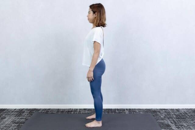 脚を腰幅に開いて立ち、足裏全体で床を踏みます。骨盤を立て、背筋を軽く伸ばした状態でスタート。ここで姿勢が崩れていると、動き全体がズレやすくなります。まずは“まっすぐ立つ”ことを意識します。