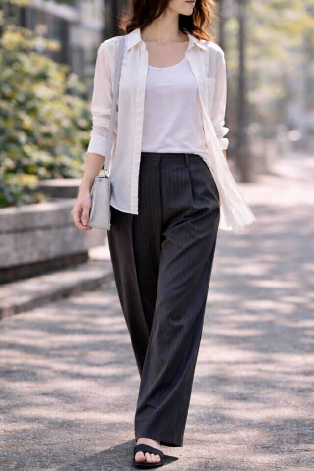 ワイドパンツは定番ですが、すべてが軽やかに見えるわけではありません。生地にハリがあるタイプはシルエットが整う一方で、動きが出にくく、コーデ全体がやや重たく見えることがあります。春の光の中では、この“動かなさ”がそのまま重さとして映りやすくなります。形がきれいでも、どこか固い印象に見えてしまうのはこのためです。