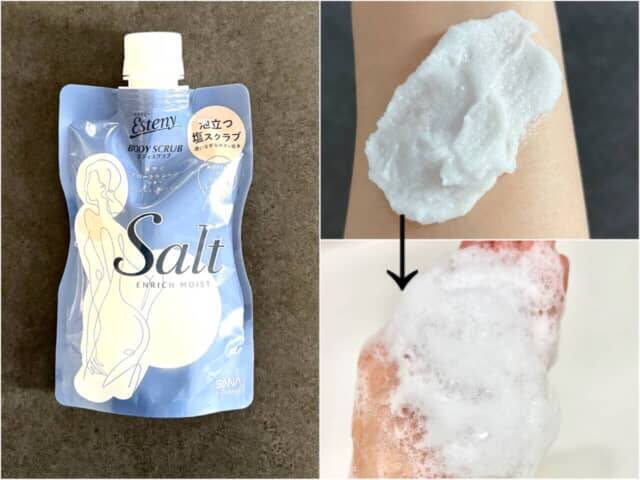 ▲サナティ エステニー ソルティスクラブ エンリッチモイスト 350g ¥1,320(税込) ※価格は編集部調べ / (右画像)シャリシャリとしたテクスチャー。泡立てネットで泡立てるとふわふわの泡に。