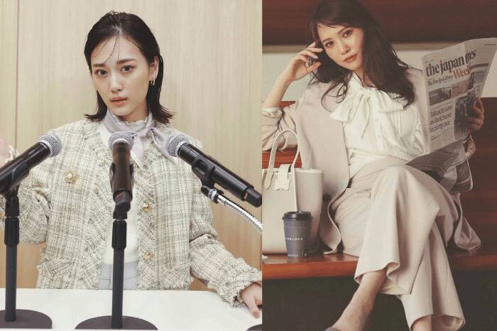 加藤が「もしも会社員だったら?」で演じたのは、“帰国子女で、外資系金融会社に勤めるバリバリのキャリアウーマン”。トレードマークの“アイドル前髪”は、さらっと横に流した大人っぽいスタイルにチェンジ。薄ピンクのパンツスーツを着て、パニーニを片手に英字新聞で日本経済をチェックする、THE“バリキャリ”スタイルに大変身。