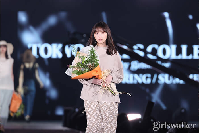 10代~30代に人気のカジュアルレディースブランド『earth music&ecology』のステージに花を抱えて登場した与田祐希。全体をベージュでまとめた“大人の女性”を思わせるコーディネートを披露。