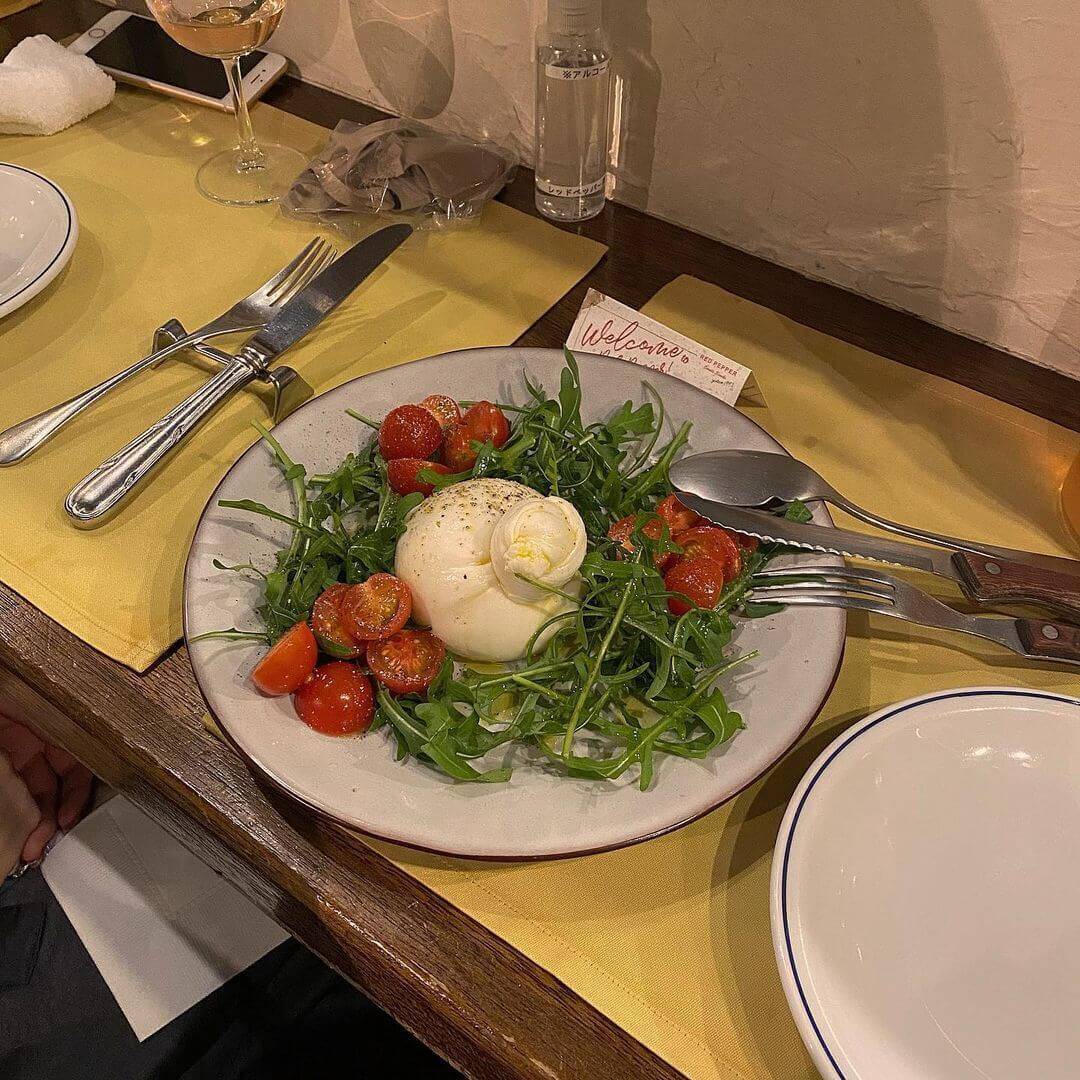 最初にご紹介するのは、表参道にある洋食屋さん『RED PEPPER(レッドペッパー)』。こちらのお店は、大きなお皿に入ったアツアツのラザニアが一番有名なお店だが、そんな絶品イタリアンと一緒にいただきたいのが、このブッラータチーズのサラダ。