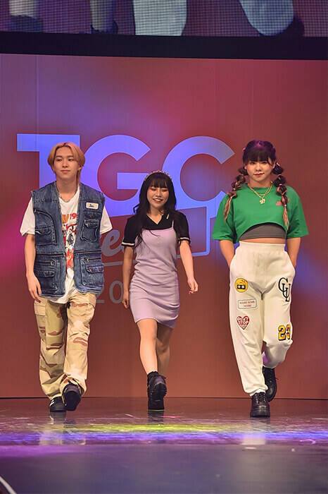 横一列に並んでランウェイを歩く3人は、客席の一人ひとりに視線を送っては、指をさしたり、手を振ったりして、YouTubeと同じような自然体。ステージと客席との距離を縮め、身近な存在だと感じさせてくれるステージだった。