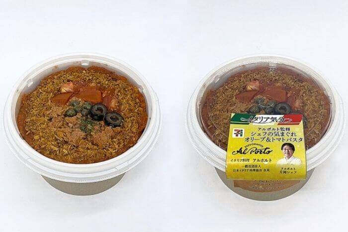 東京西麻布のイタリア料理店「アルポルト」片岡シェフ監修商品。トマトベースのソースにトマト、ツナ、スライスオリーブ、ケイパーを盛り付けたパスタ。