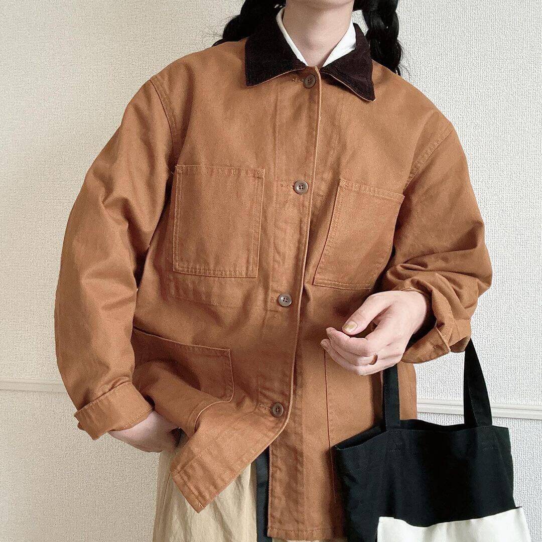 ワークウェアらしい、しっかりとした綿素材を使用したジャケット。襟にはコーデュロイを使ってアクセントに!実用的なデザインだから、スウェットなどラフなアイテムから、センタープレスパンツのようなキレイめアイテムまで、幅広く着回せるのが嬉しい♡4パッチポケットに加えて内ポケット付きで、機能面も優秀◎
