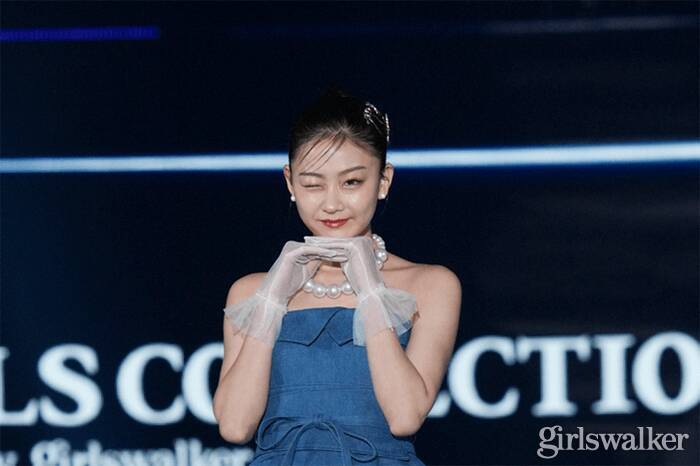 さまざまなドレスを展開する「DAZZY」のステージに登場したみとゆな。大胆にデコルテや肩を見せたベアトップのミニドレスを纏い、セクシーでクールな魅力を披露。
