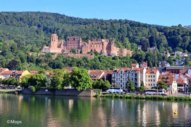 大樽を見た後は、お城のテラスからハイデルベルクの旧市街を眺めてみましょう。ネッカー川のほとりに佇む風光明媚な町並みは、いつまで見ていても飽きません。対岸の山の中腹には「哲学の道」があり、ここからは旧市街とお城をセットで見られるので覚えておくと便利ですよ。