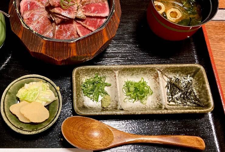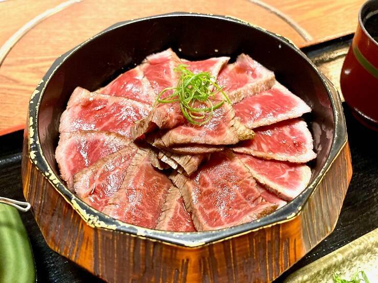 注文してから約10分。テーブルに運ばれてきたのは、手の平いっぱいの大きなサイズの碗に盛り付けられたひつまぶしです。重ねるように白米の上に敷きつめられた牛肉のボリュームと輝くようなツヤ感に、食べる前から圧倒されます。