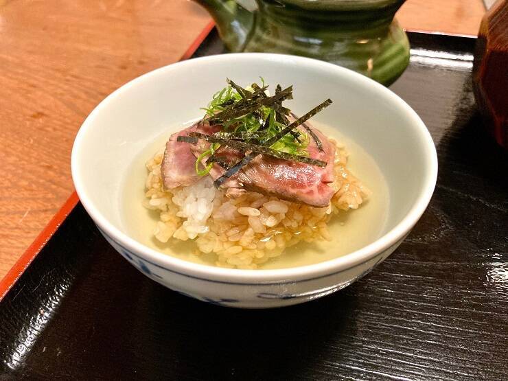 これだけでも十分に和牛を満喫できますが、最後はやはりお茶出汁をかけていただきます。出汁は、肉の味の邪魔をしないように薄味になっており、特製のタレが染みこんだ白米と出汁、そして肉の旨みが見事にマッチします。