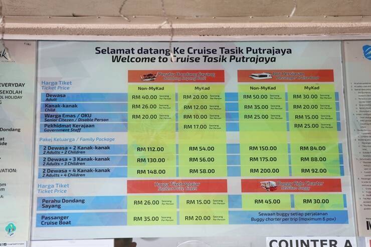 料金はクルーズの種類によって異なり、サイトシーイングクルーズは大人RM50・子供RM35です。