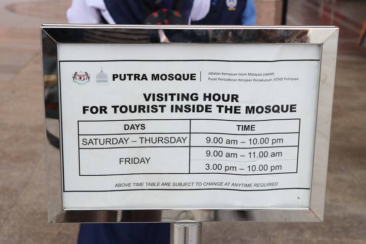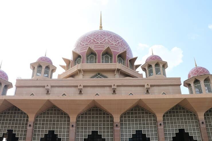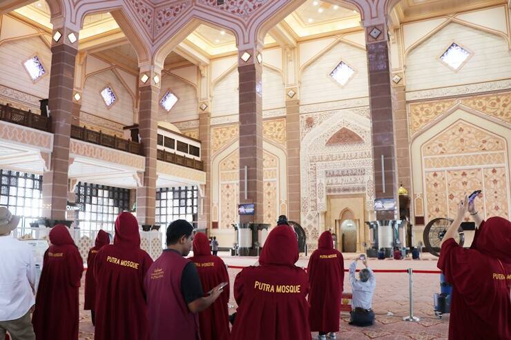 プトラモスクは、イスラム教徒でなくても内部を見学できます。女性およびショートパンツの男性は、入り口でピンクのローブ(無料貸出)を着用して中に入りましょう。
