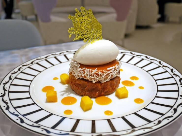 宮崎マンゴーを使用したデセール ア ラシェットは、ココナッツがほんのり香るパンペルデュの上に、ココナッツがあしらわれたカラメル風味の濃厚なクリームと、ココナッツのソルベが乗った見た目も美しいデザート。