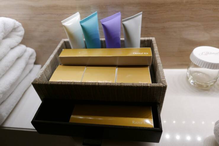 アメニティーは、シャンプー、コンディショナー、シャワージェル、ボディークリーム、コットン、石鹸、レザーキット、シャワーキャップなど充実しており、海外では付いていないことも多い歯ブラシセットも用意されています。