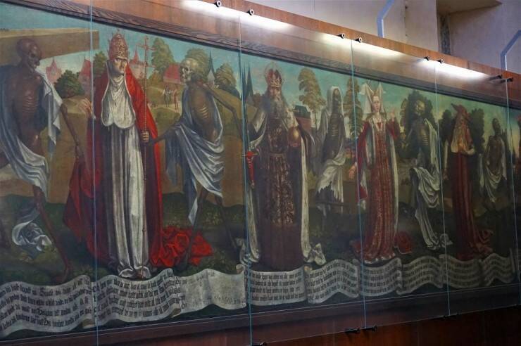 法王や皇帝、枢機卿らがいやいやながら「死」とダンスをする様子が描かれていて、もともとは社会のあらゆる階層の人々がともにダンスを繰り広げる光景が描かれた長い作品だったそうです。