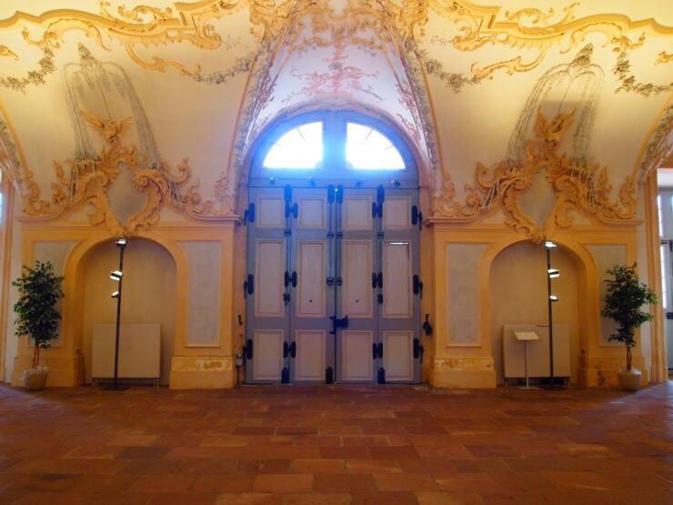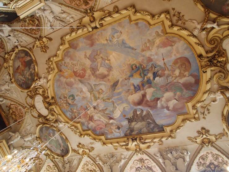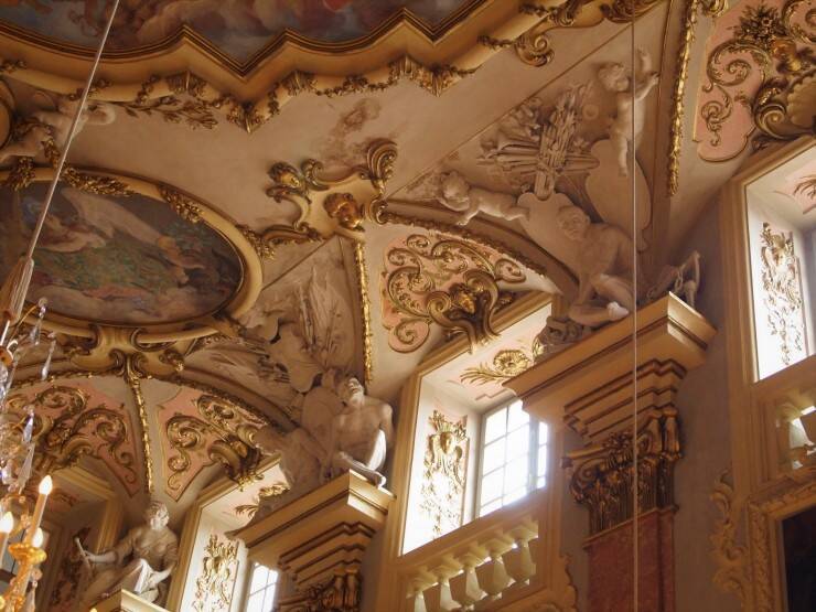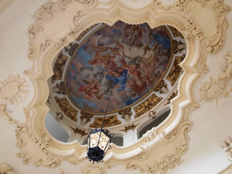 広間から階段を上がっていくと、ロココ式とバロック式の融合した優雅な控えの間にたどり着きます。天井には、面白い形をしたフレスコ画も。